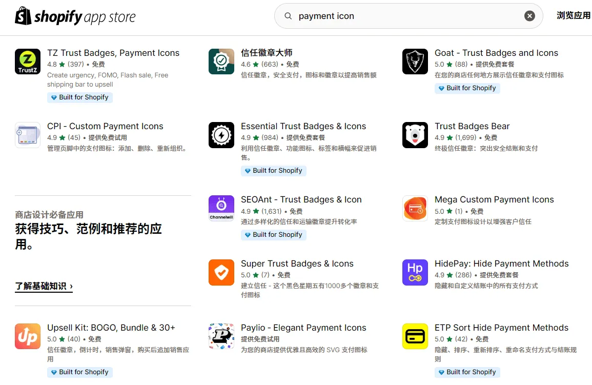 在app商店中有许多信任徽章应用,搜索相关关键词例如 “payment icon” 就可以找到,一些插件也提供免费套餐