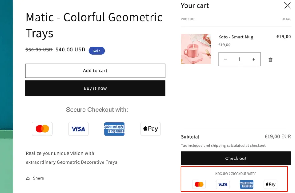 afterpay - american_express - apple_pay - bitcoin - dankort - diners_club - discover - dogecoin - dwolla - facebook_pay -forbrugsforeningen - google_pay - ideal - jcb - klarna - klarna-pay-later - litecoin - maestro - master - paypal - shopify_pay - sofort - unionpay - visa通过在产品页面显示你的网站支持的付款方式,有助于提升客户信任。