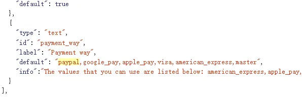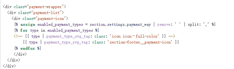 {% comment %} 在下方assign payment_types中填写你想要自定义的付款方式名称即可。本提示不会在网站上显示。{% endcomment %}{% assign payment_types = 'paypal,apple_pay,google_pay,visa,master,discover' | split: ',' %}