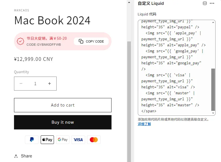 我们可以通过添加Liquid代码来实现这个功能,对于不同主题由于其功能结构的不同修改的文件也不同,通常修改 main-product.iquid 和 footer.liquid 即可实现